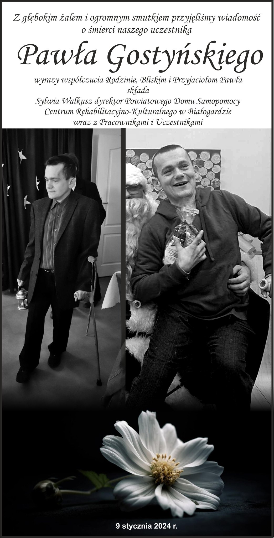 Łączymy się z ogromnym smutkiem i bólem … po śmierci naszego uczestnika Pawła Gostyńskiego, który odszedł 9 stycznia 2024 r.