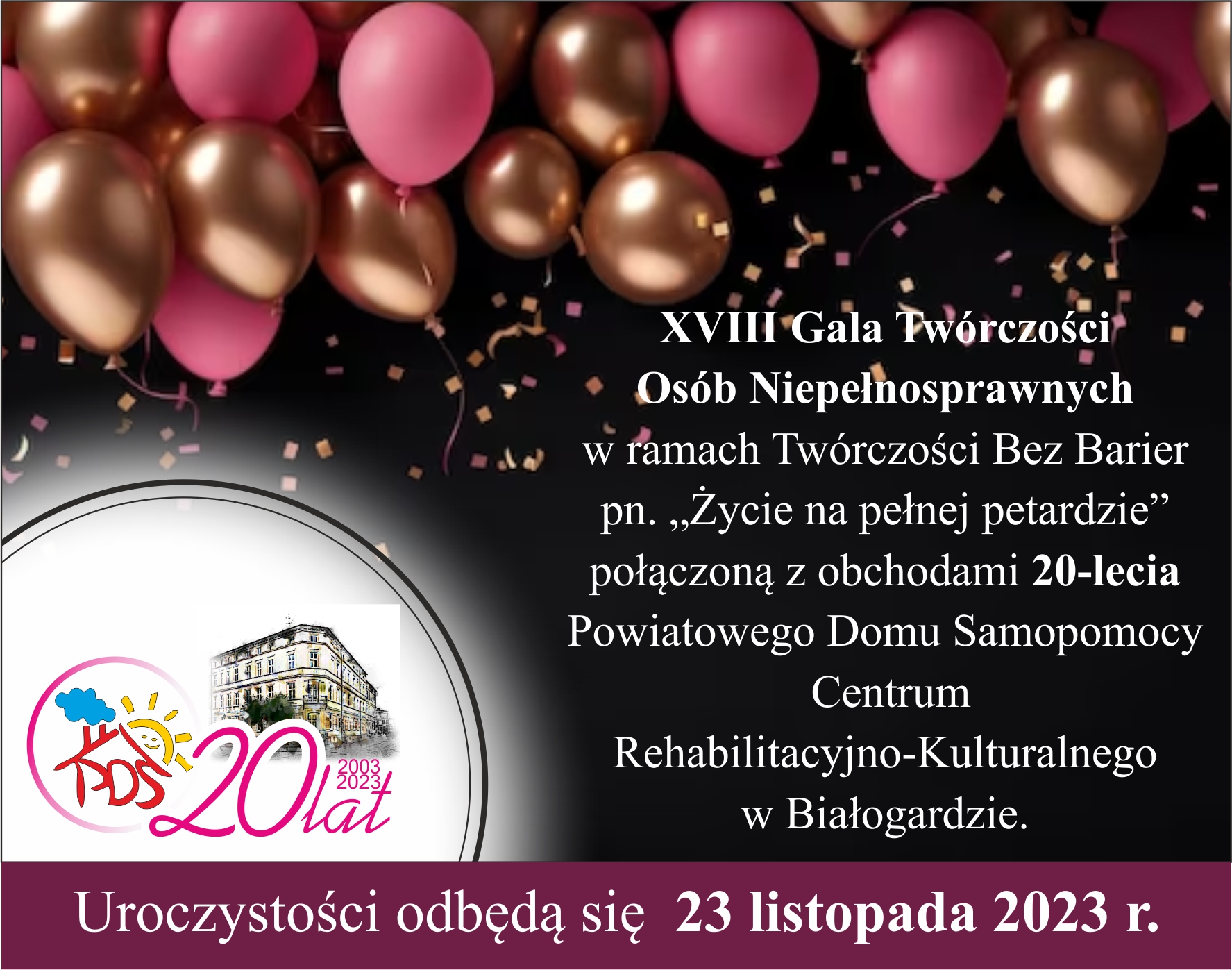 23 listopada 2023 r. odbędzie się XVIII Gala Twórczości Osób Niepełnosprawnych w ramach Twórczości Bez Barier pn. “Życie na pełnej petardzie”.   Osoby z różnymi niepełnosprawnościami mają ogromną siłę wewnętrzną, determinację i umiejętność cieszenia się życiem pomimo codziennych trudności. Dlatego nasze występy będą przepełnione radością i energią aby udowodnić, że osoby te mogą być równo traktowane aby móc cieszyć się życiem tak samo jak inni. Udział w Gali potwierdziło aż 17 ośrodków z regionu naszego województwa. Tego dnia będziemy także obchodzić 20 lat istnienia naszego Ośrodka, który powstał w grudniu 2003 r. Cieszymy się, że zaproszeni goście, przyjaciele, rodzice i my wszyscy będziemy razem aby świętować tą uroczystość!